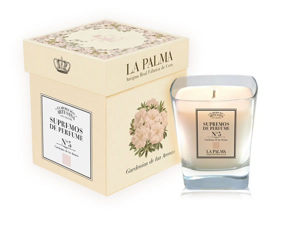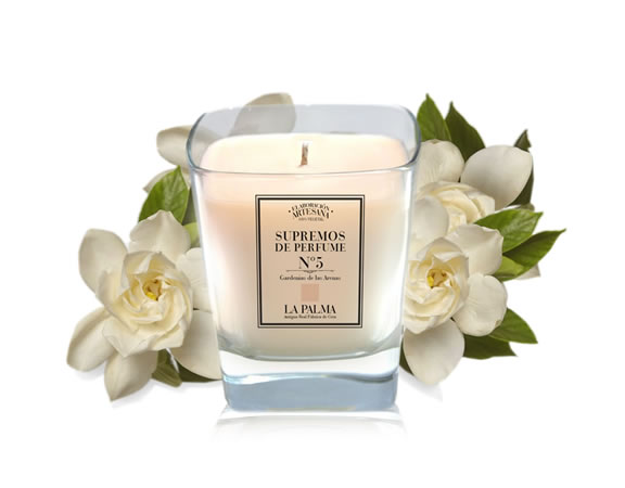 Vela de Supremo de Gardenias. Gardenias frescas cubriendo un muro entre el musgo de la piedra labrada. Vela de 280 grs. (50 - 60 horas). Presentada en caja individual de cartón forrado. |