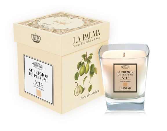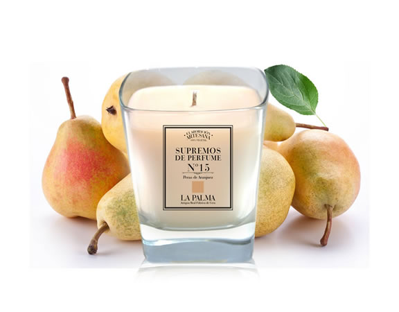 Vela de Supremo de Peras Dulces de Aranjuez. La frescura de la flor unida a la dulzura de la fruta fresca en el árbol. Un perfume de fruta dulce mezclada con flor. Vela de 280 grs. (50 - 60 horas). Presentada en caja individual de cartón forrado. |